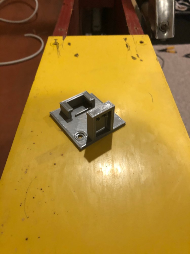 Now that all of these have wires on them they can be cabled up and tested. One problem with this is the optical modules obviously aren’t the same form factor as the mechanical switches. Luckily I have a 3D printer. A few years ago I bought a MonoPrice Mini Select 3D printer on sale fro $180 shipped with 1kg of PLA. I’ve really only used it for printing kids toys and fixing small appliance parts. Most of the things I’ve printed came from Thingiverse. The optical modules needed a custom mount to match the mounting holes in the Skee-Ball machine as well as a way to hold the module and a small PCB for cable connections. Autodesk makes CAD tools like Fusion360 which you can get as a hobbyist for free or TinkerCAD. I used TinkerCAD for this because it was easier to use on my laptop.